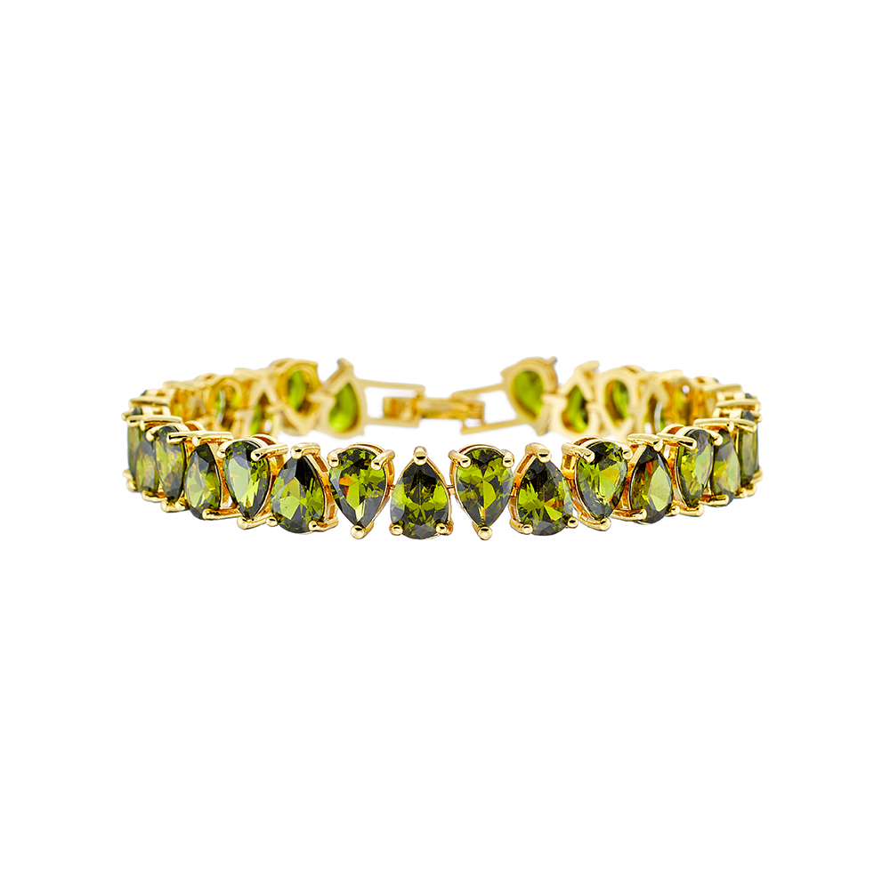 Bratara tennis realizata din aliaj placat cu aur galben de 18 K si decorata cu pietre cubic zirconia verzi sub forma de lacrima. Recomandari de purtare: