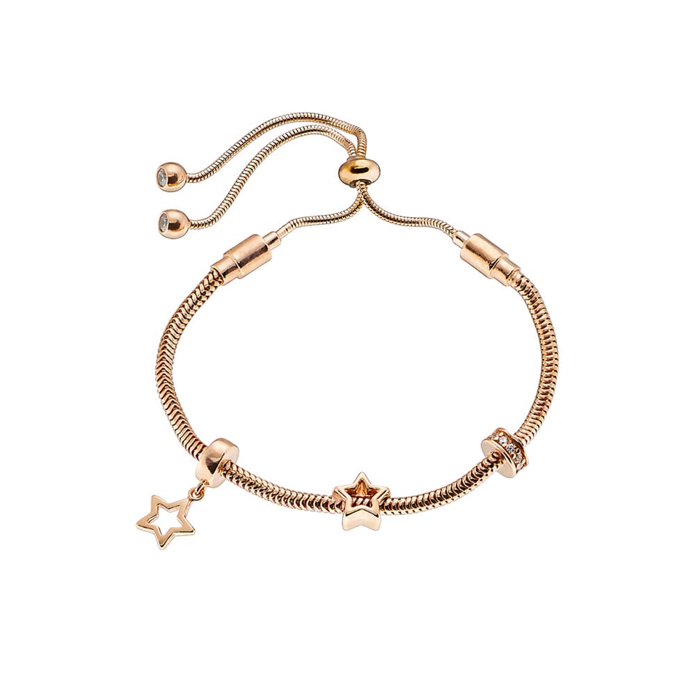 Bratara ajustabila realizata din otel inoxidabil placat cu aur roz de 18 K decorata cu doua stelute si o sfera. Reprezinta cadoul ideal pentru orice ocazie!