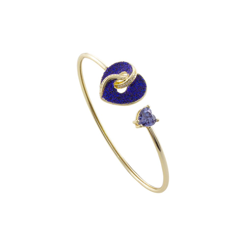 Bratara fixa realizata din metal comun placat cu aur galben de 18K decorata cu element inima presarat cu glitter albastru si o piatra cubic zirconia albastra.