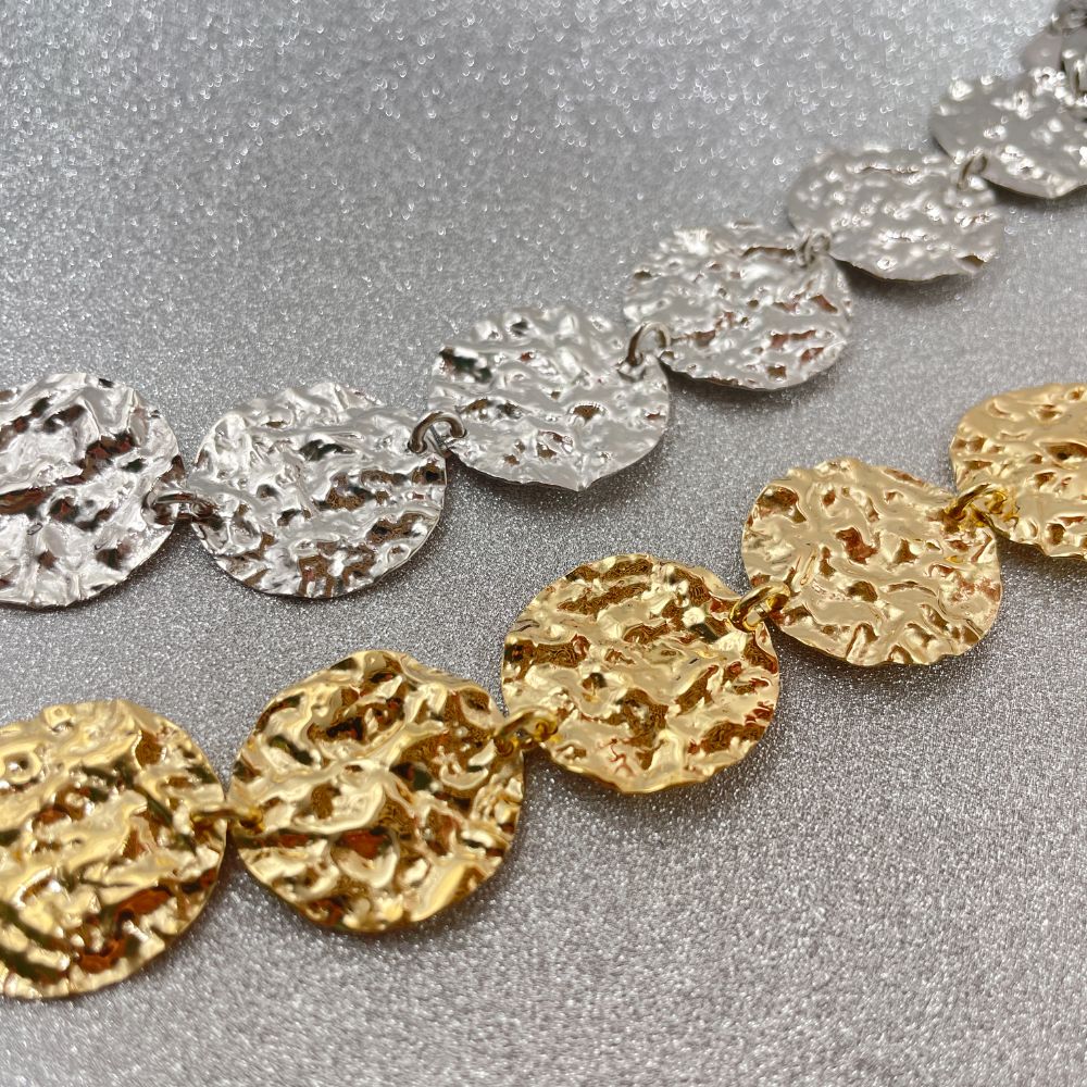 Bratara statement realizata din argint 925 placat cu rodiu decorata cu cercuri goale cu textura aparte.