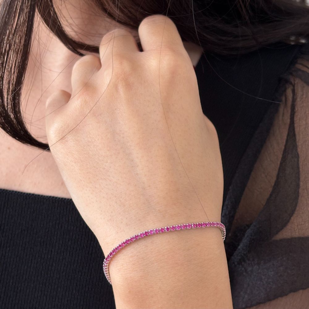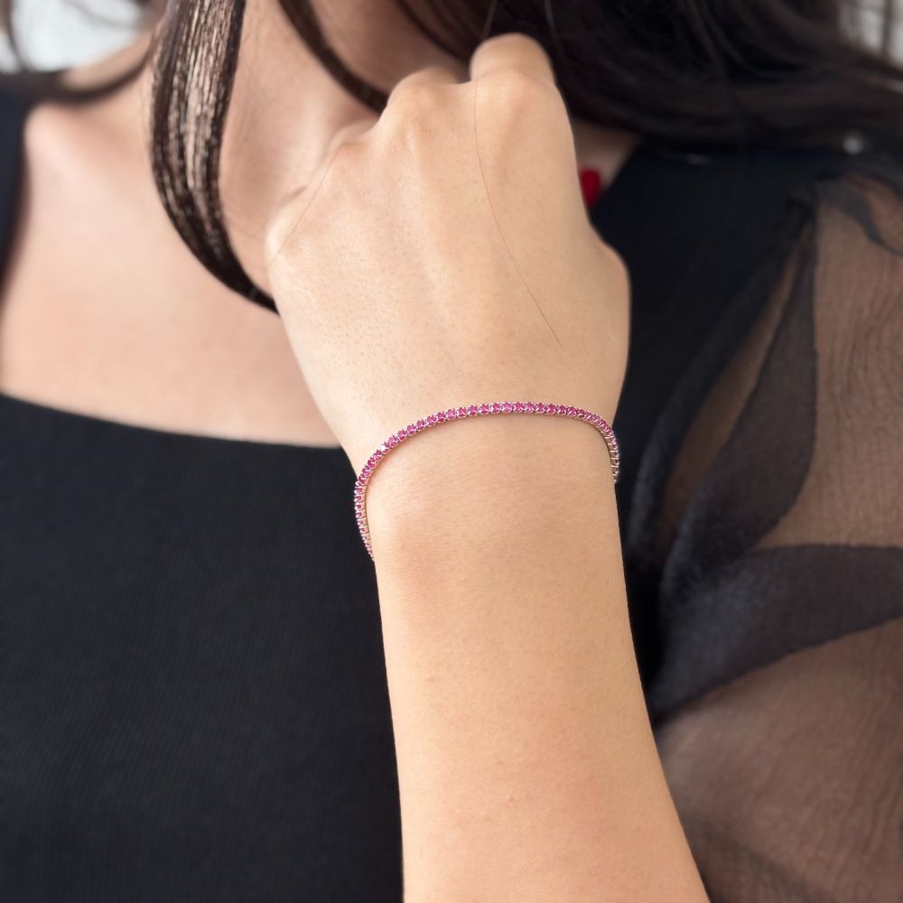 Bratara tip tennis realizata din argint 925 placat cu rodiu, decorata cu pietre cubic zirconia rosii.