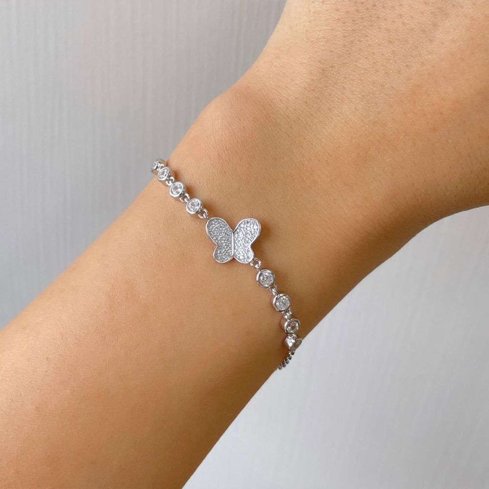 Bratara realizata din argint 925 placat cu rodiu decorata cu pandantiv fluture si cubic zirconia incolore.