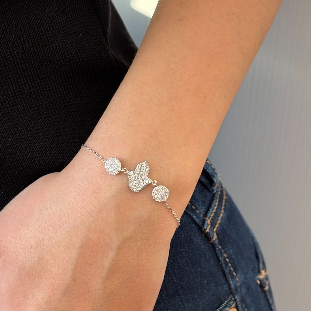 Bratara realizata din argint 925 placat cu rodiu decorata cu pandantive in forma de banuti si hamsa, cu cristale zirconia.