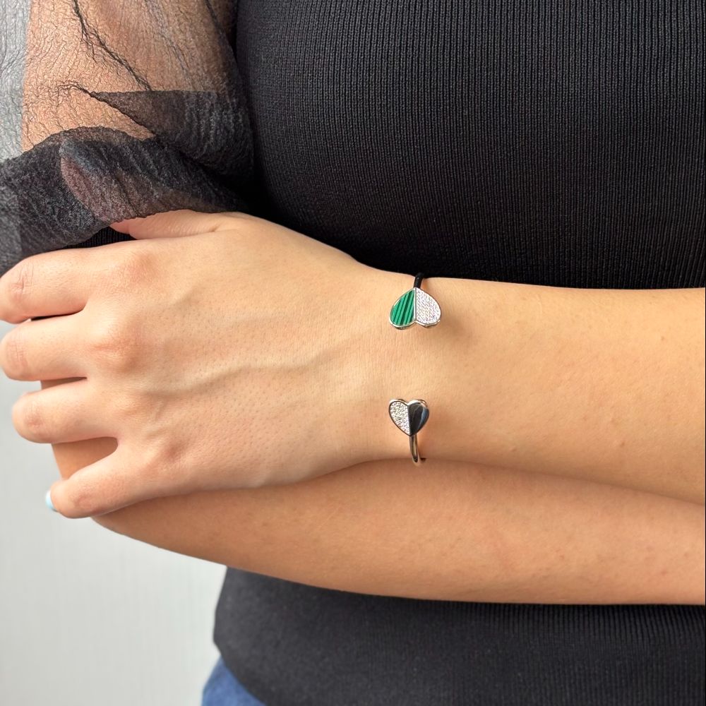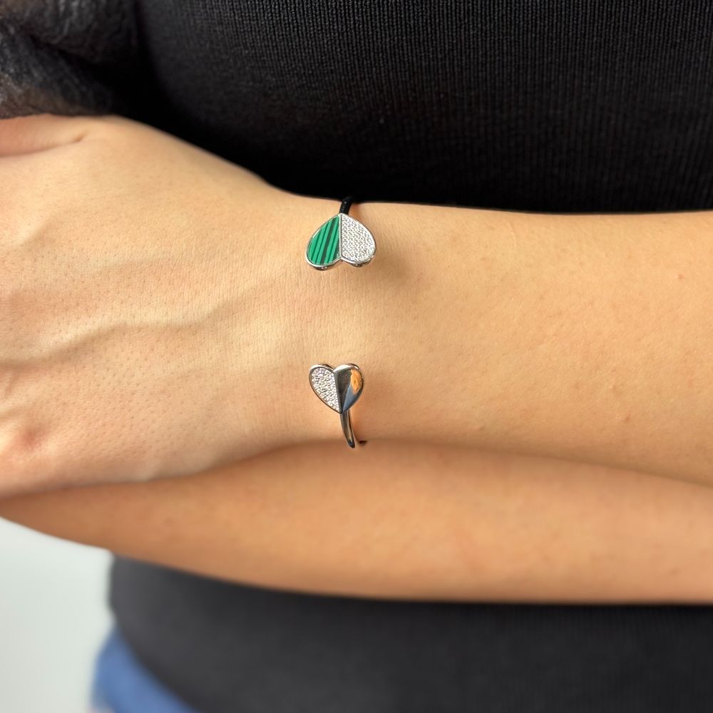 Bratara fixa realizata din argint 925 placat cu rodiu, cu elemente in forma de inima, decorate cu cristale zirconia si malachit.