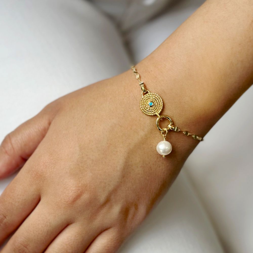 Bratara realizata din argint 925 placat cu aur galben de 18 K decorata cu un inel, o spirala cu piatra cubic zirconia albastra in interior si o perla de cultura.