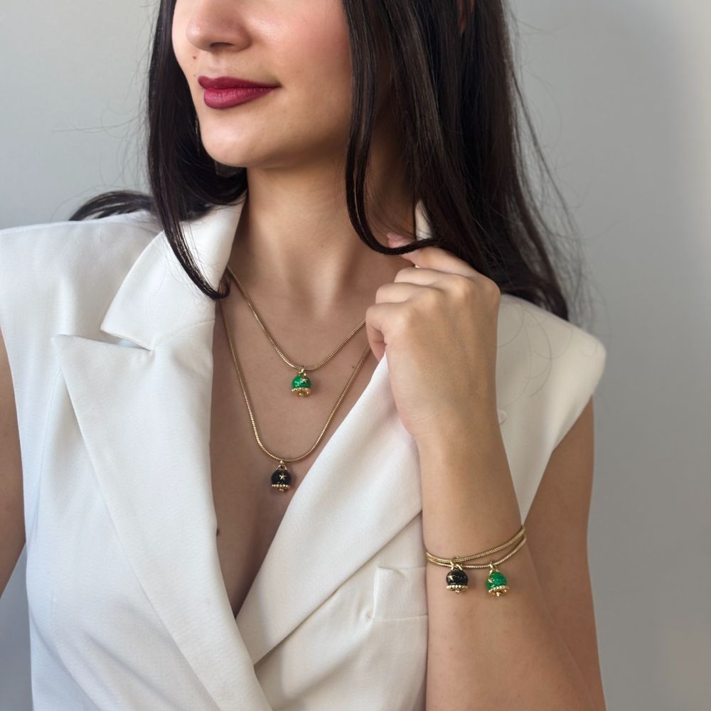 Bratara placata cu aur de 18K cu clopotel placat cu email verde Lucky Charm