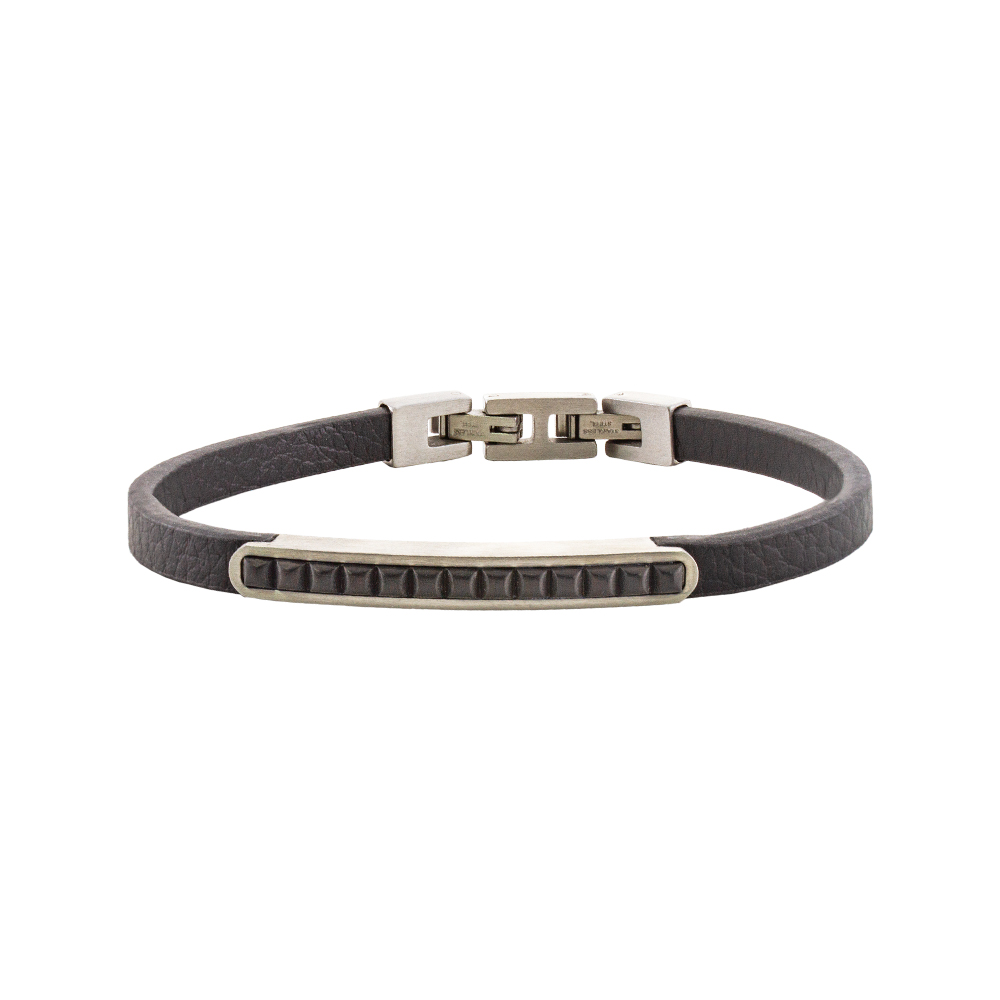 Bratara pentru barbati compusa din piele ecologica neagra si elemente din otel inoxidabil placat cu rodiu. Recomandari de purtare: