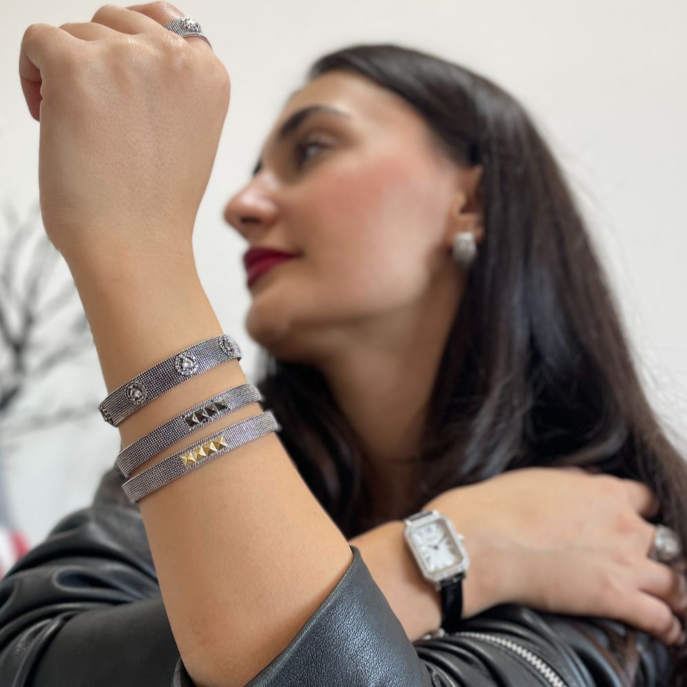 Bratara fixa realizata din metal comun placat cu rodiu si decorata cu 4 piramide aurii si pietre cubic zirconia incolore.