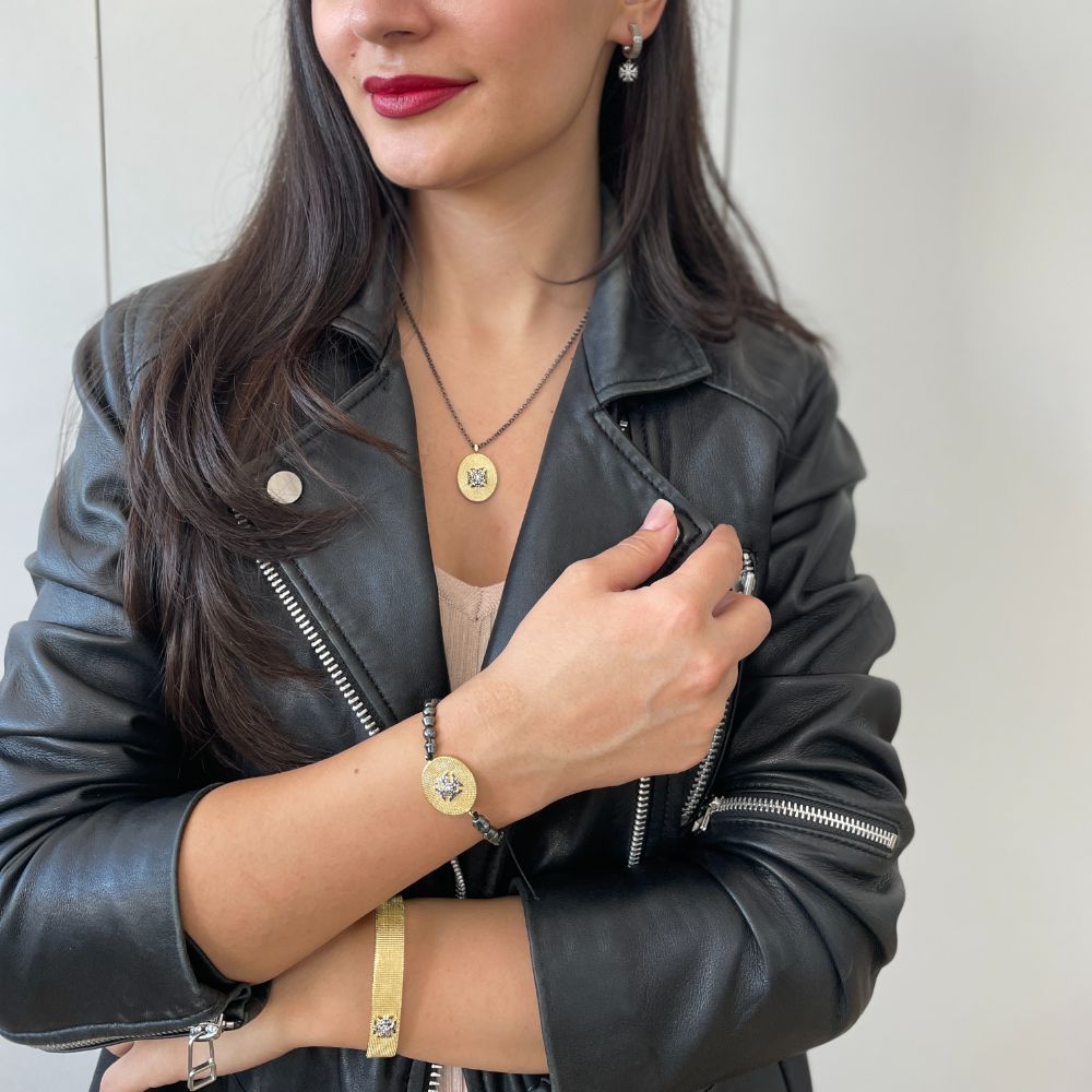 Poarta bratara peste o bluza cu maneca lunga, usor stransa la incheietura, intr-o tinuta casual-eleganta de zi. Combineaza cu pantaloni negri conici si pantofi simpli, iar la restul bijuteriilor pastreaza doar cercei mici, astfel incat crucea sa ramana punctul focal al look-ului.