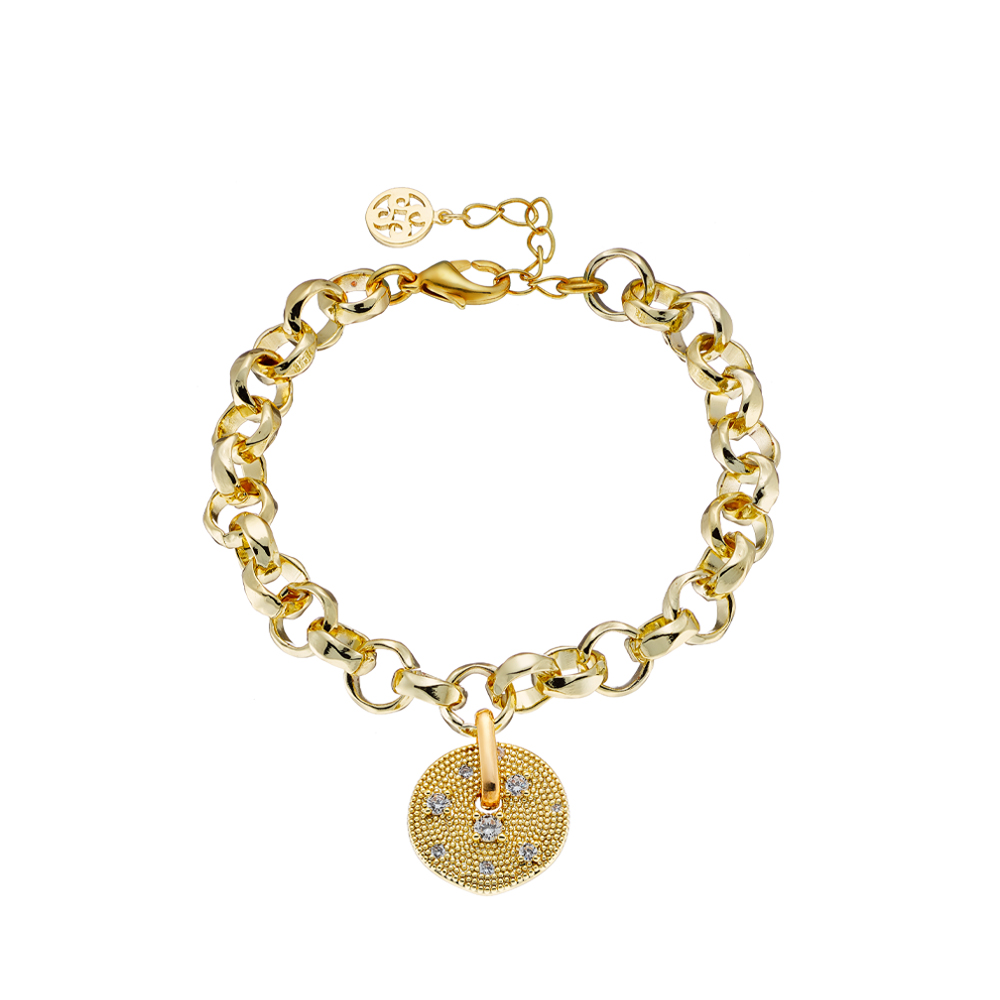 Bratara cu zale realizata din metal comun placat cu aur galben de 18 K decorata cu banut si pietre cubic zirconia incolore.