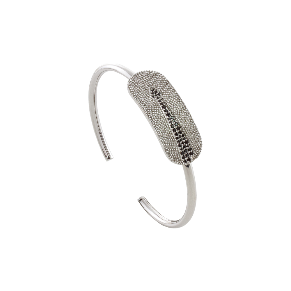 Bratara fixa realizata din metal comun placat cu rodiu decorata cu pandantiv oval presarat cu pietre cubic zirconia negre sub forma de sageata.