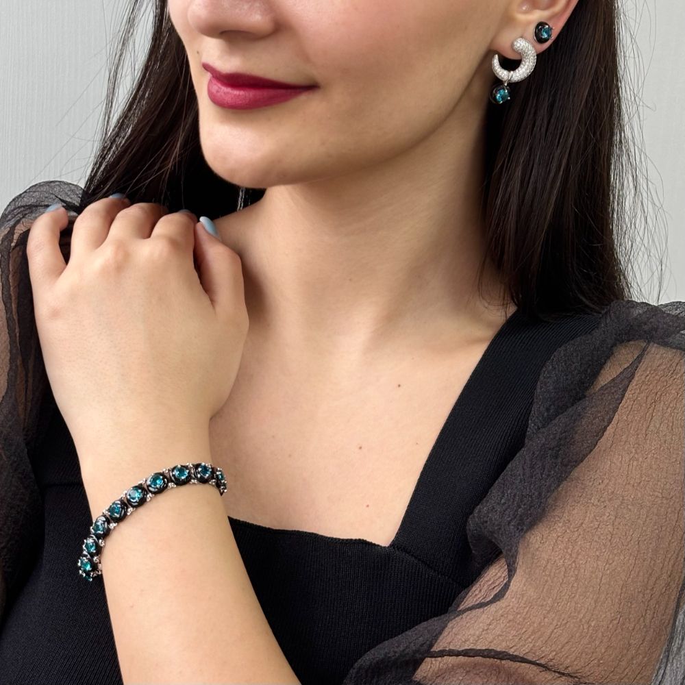 Bratara tennis realizata din metal comun placat cu rodiu decorata cu email negru si pietre cubic zirconia albastre.