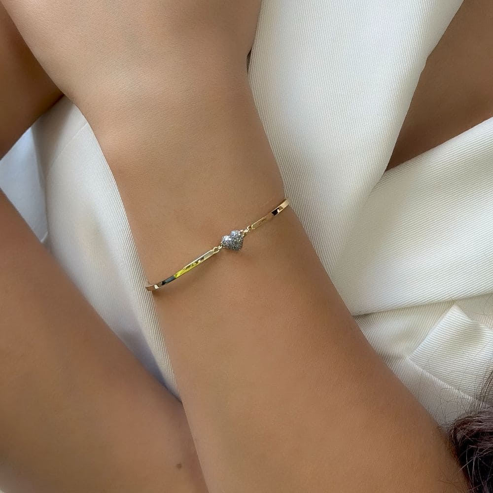 Bratara fixa realizata din metal comun placat cu aur galben de 18 K decorata cu inima presarata cu glitter argintiu. Recomandari de purtare: