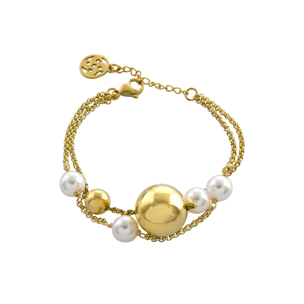 Bratara dubla realizata din otel inoxidabil placat cu aur galben de 18K decorata din loc in loc cu sfere si perle de sticla.