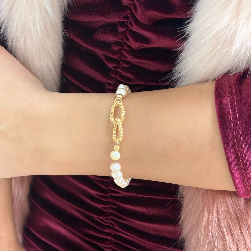 Poarta bratara Holiday singura, pe o tinuta sobra, pentru a evidentia contrastul dintre textura mata a perlelor si finisajul metalic al zalelor.