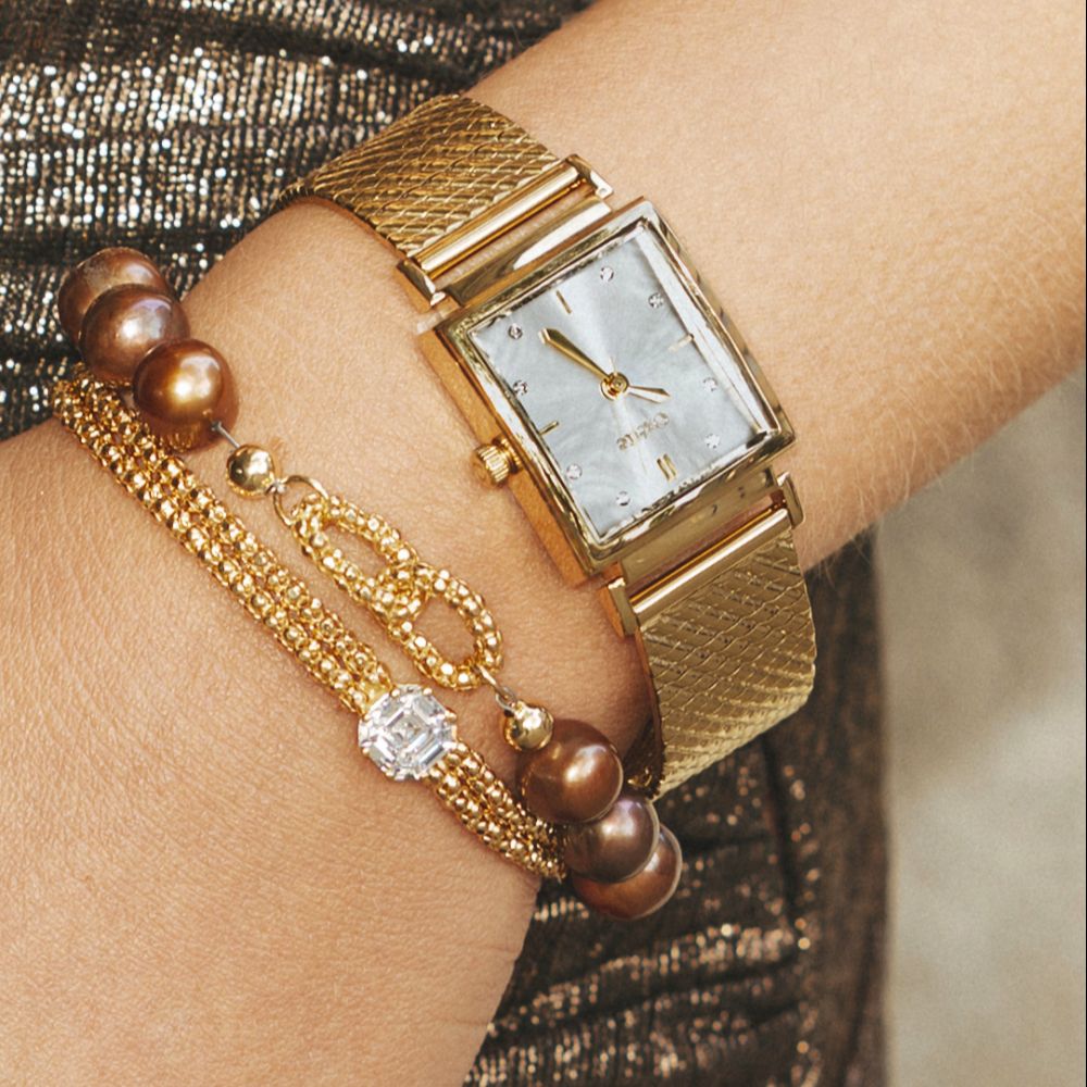 Poarta bratara Holiday suprapusa peste maneca unei camasi sau pulovere cu croiala simpla, pentru a transforma accesoriul intr-un detaliu vizual modern si sofisticat.
