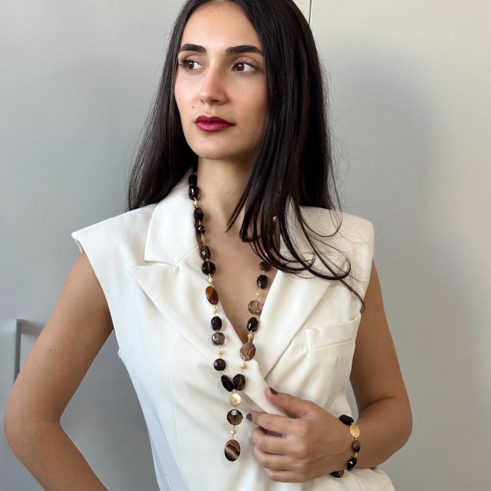 Bratara realizata din argint 925 placata cu aur galben de 18K decorata cu agate maro.