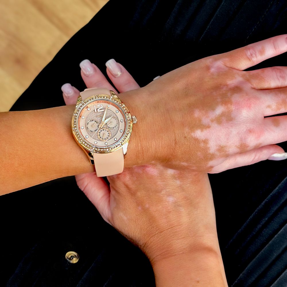 Descrierea produsului Ceas dama placat cu aur galben de 18 K si bratara din silicon nude Africa: