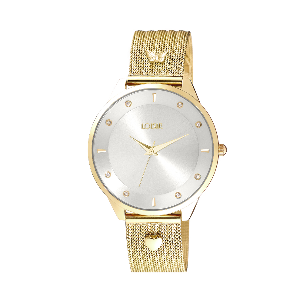 Ceas compus din carcasa din aliaj si bratara metalica tip mesh din otel inoxidabil placate cu aur galben de 18 K. Bratara este decorata cu fluture si inima, iar interiorul cadranului este argintiu.