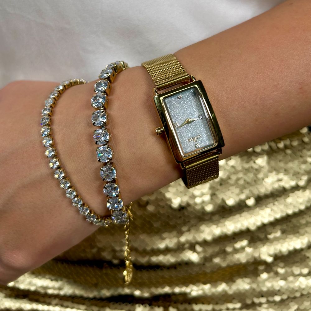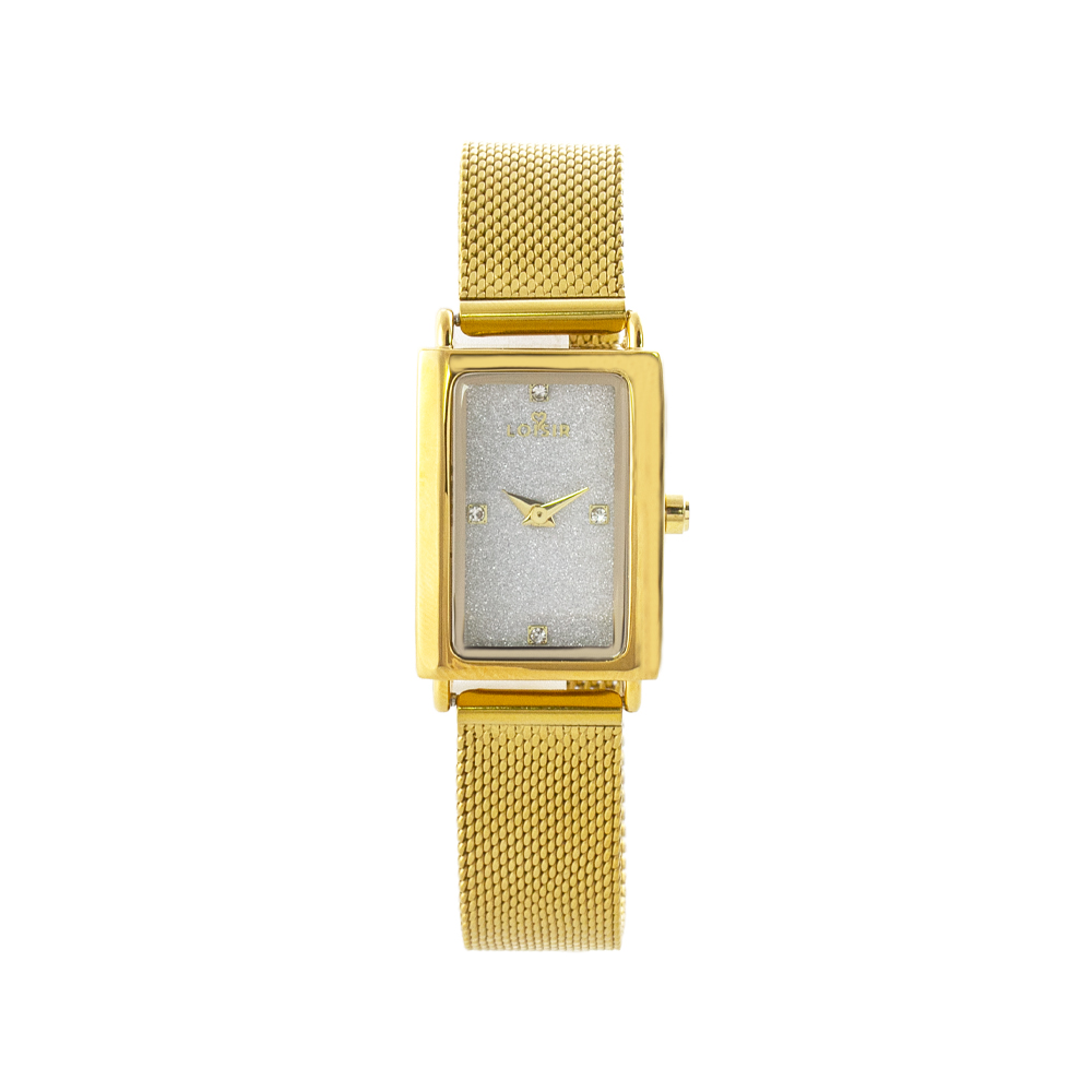 Ceas cu cadran dreptunghiular decorat cu glitter argintiu din otel inoxidabil si bratara tip mesh din aliaj, placat cu aur galben 18k.