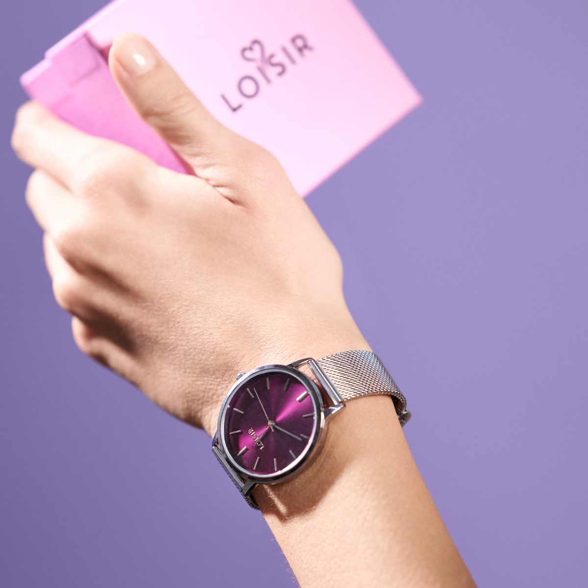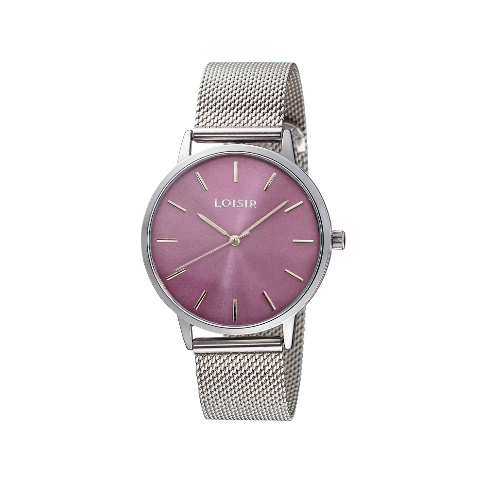 Cadranul mov vibrant face din acest ceas piesa centrala a unei tinute office in tonuri de gri sau bleumarin. Ofera un contrast cromatic sofisticat, fiind ideal de purtat cu o camasa alba si parul coafat lejer.
