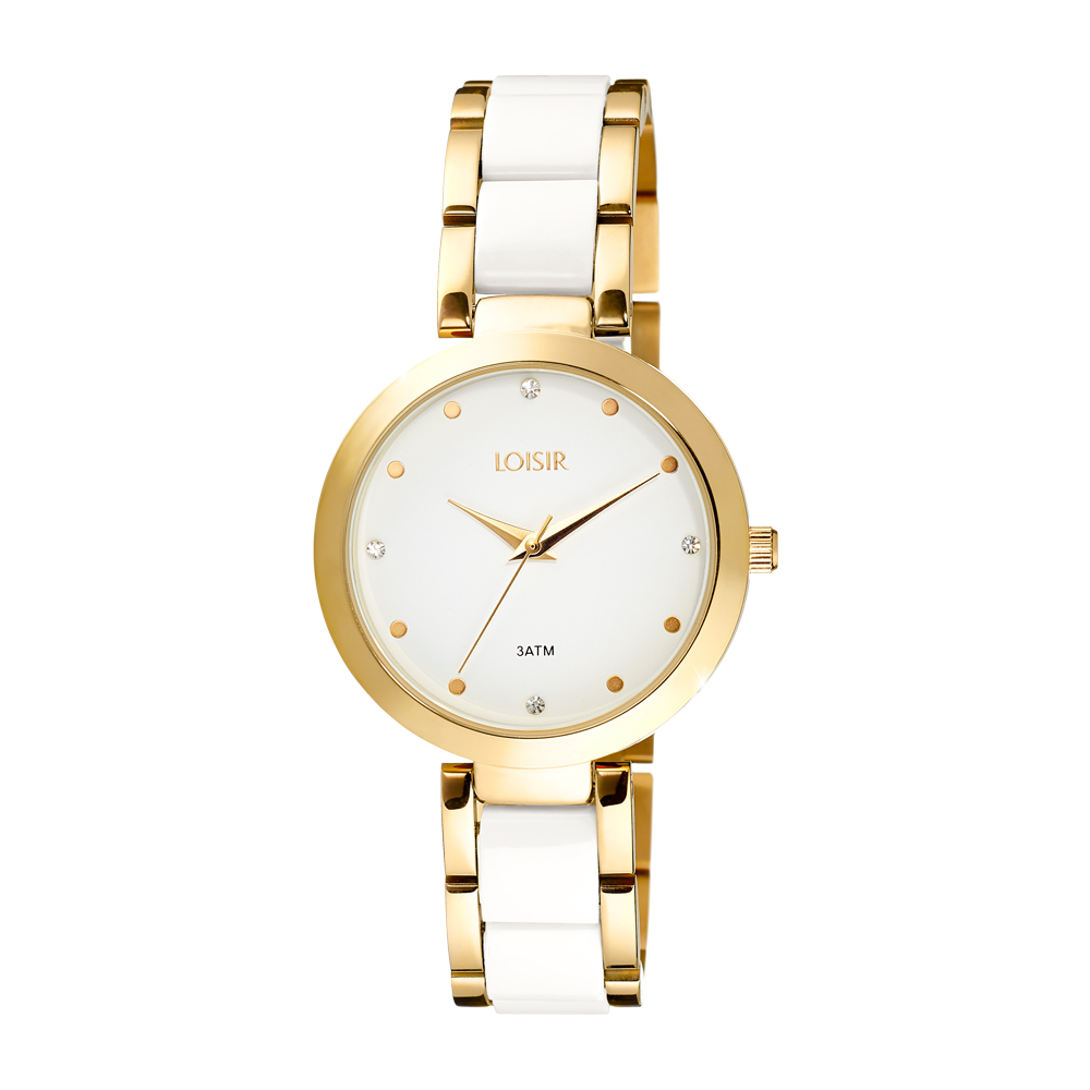 Ceas compus din bratara metalica din aliaj placat cu aur galben de 18 K si rasina alba decorat cu cadran alb.