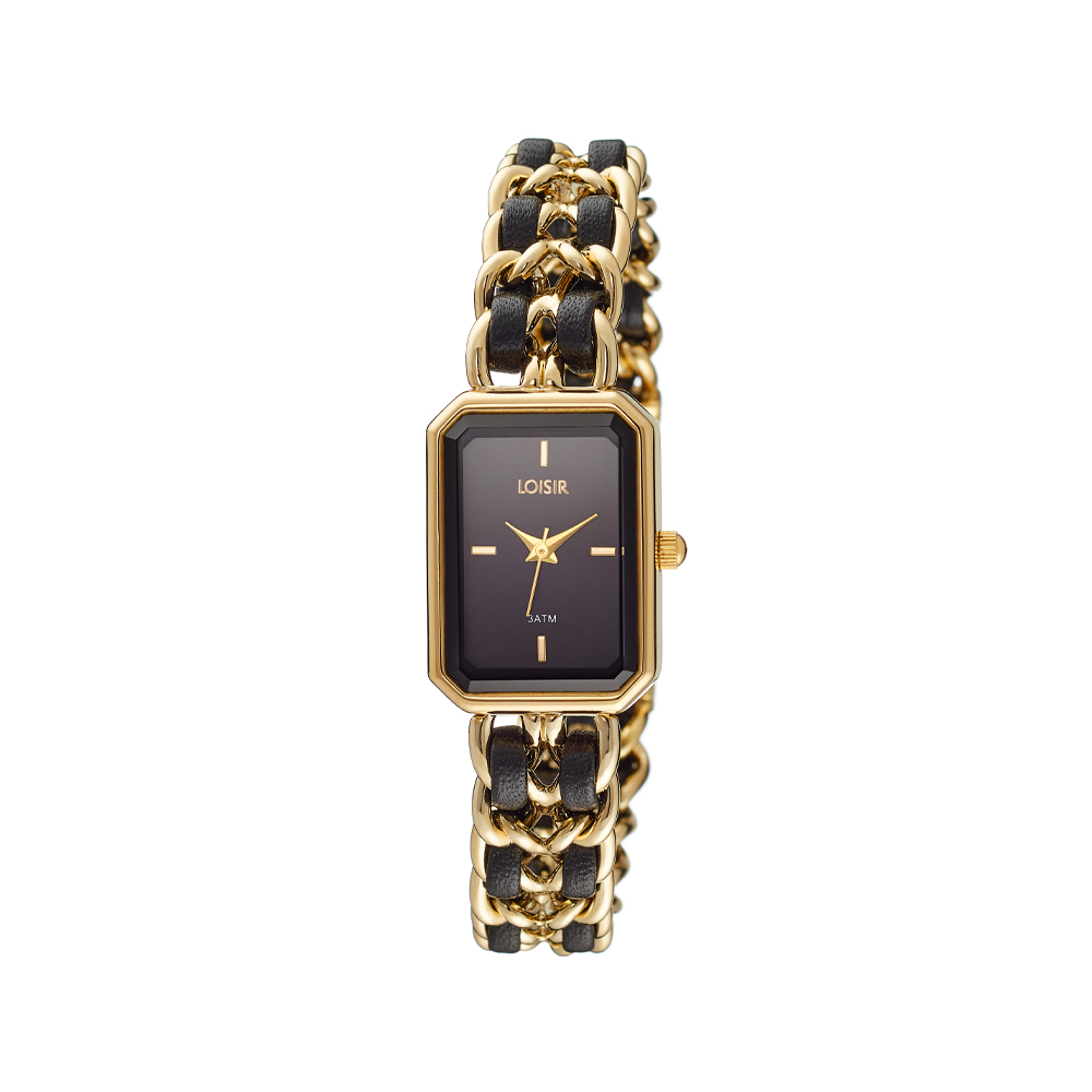 Ceas cu cadran dreptunghiular negru din otel inoxidabil si bratara tip bijuterie cu piele neagra din aliaj placat cu aur de 18K.