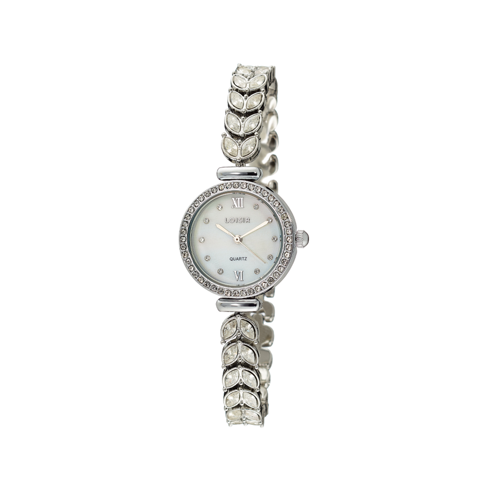 Ceas-bijuterie de dama realizat din metal comun placat cu rodiu format din cadran sidefat si bratara metalica inconjurata de pietre cubic zirconia incolore.