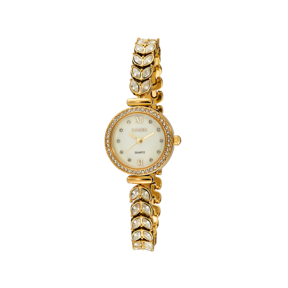 Ceas-bijuterie de dama realizat din metal comun placat cu aur galben de 18K format din cadran sidefat si bratara metalica inconjurata de pietre cubic zirconia incolore.