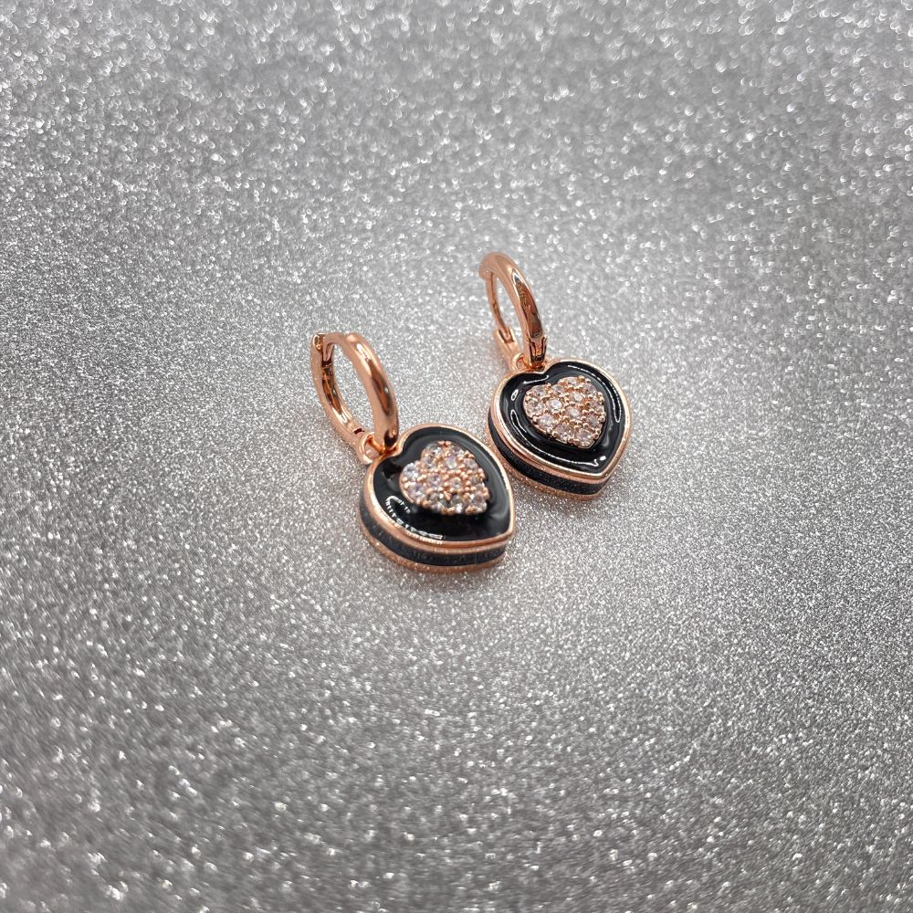 Cercei cu inima placati cu aur roz de 18 K si decorati cu email negru Beauty