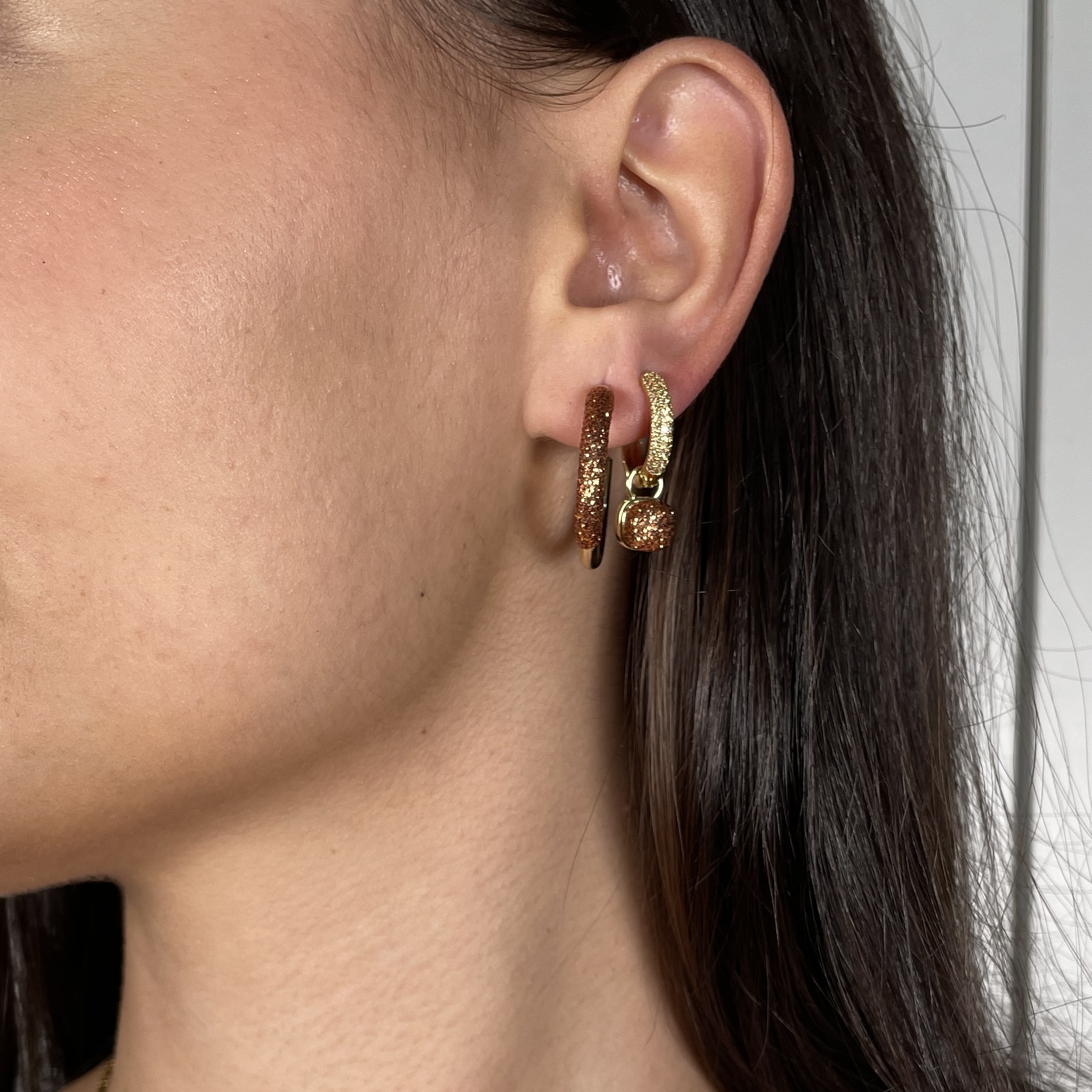 Cercei creole realizati din metal comun placat cu aur galben de 18K decorati cu elemente patrate presarate cu glitter maro si pietre cubic zirconia incolore.