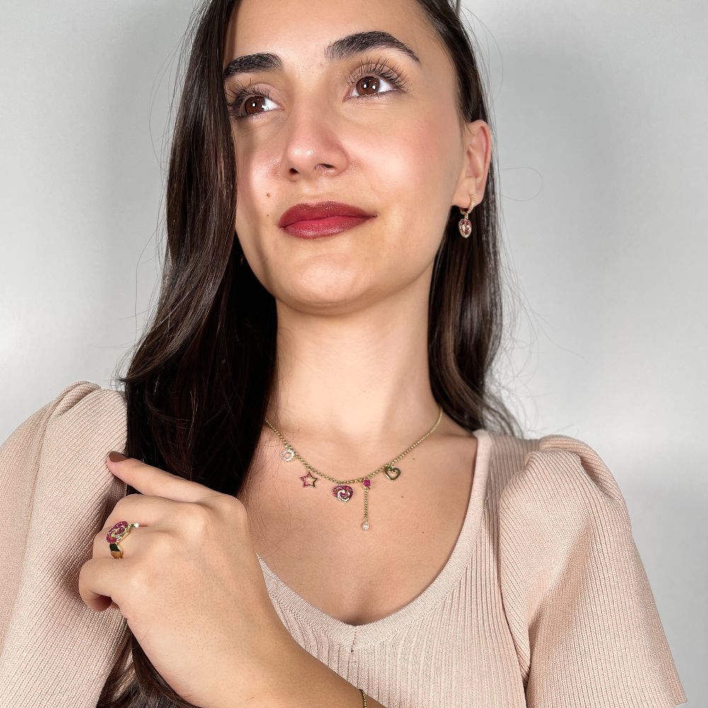 Colier scurt placat cu aur de 18K cu pandantiv inima si glitter roz Dolley