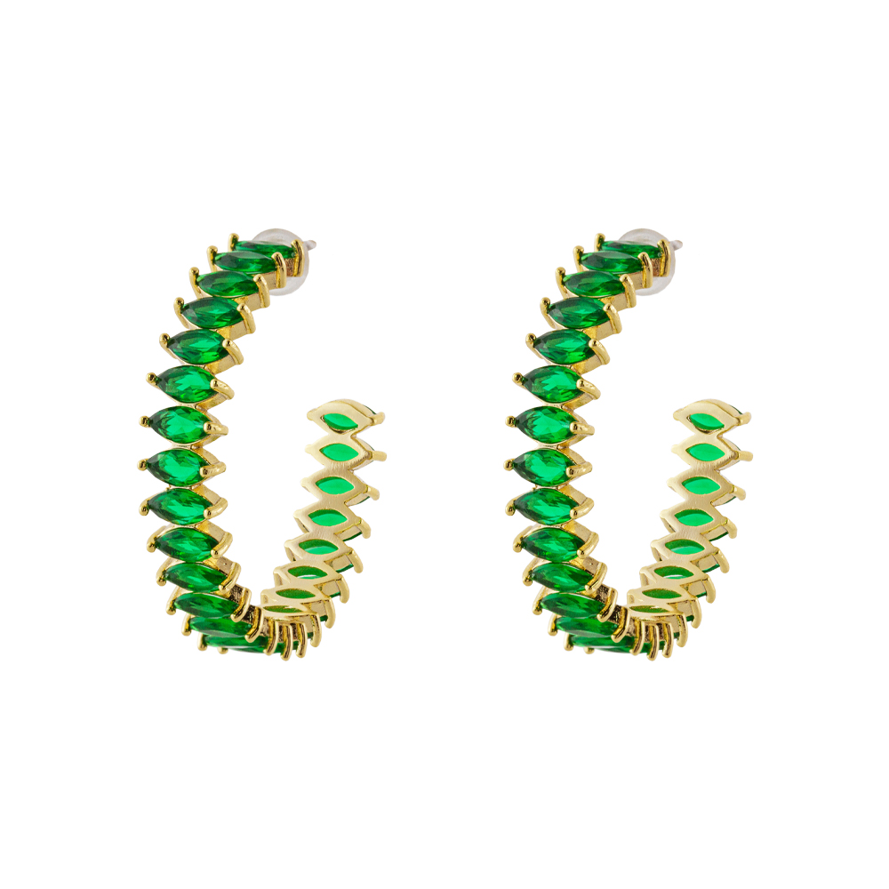 Cercei creole realizati din metal comun placat cu aur galben de 18 K si decorati cu pietre cubic zirconia verzi.