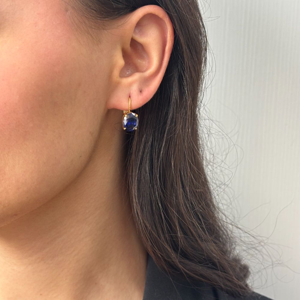 Acesti cercei cu piatra albastru regal (royal blue) emana o eleganta clasica, fiind accesoriul ideal pentru a completa o camasa din poplin alb sau o rochie tip sacou intr-o nuanta de bleumarin. Se armonizeaza superb cu parul coafat intr-un bob bine definit sau prins intr-o coada joasa, eleganta, lasand profunzimea culorii sa atraga toate privirile.