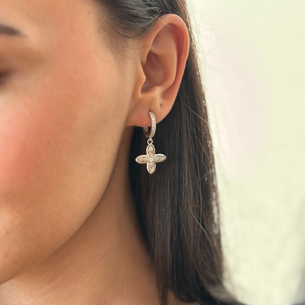 Cercei rotunzi realizati din argint 925 placat cu rodiu decorati cu sidef si cristale zirconia incolore.