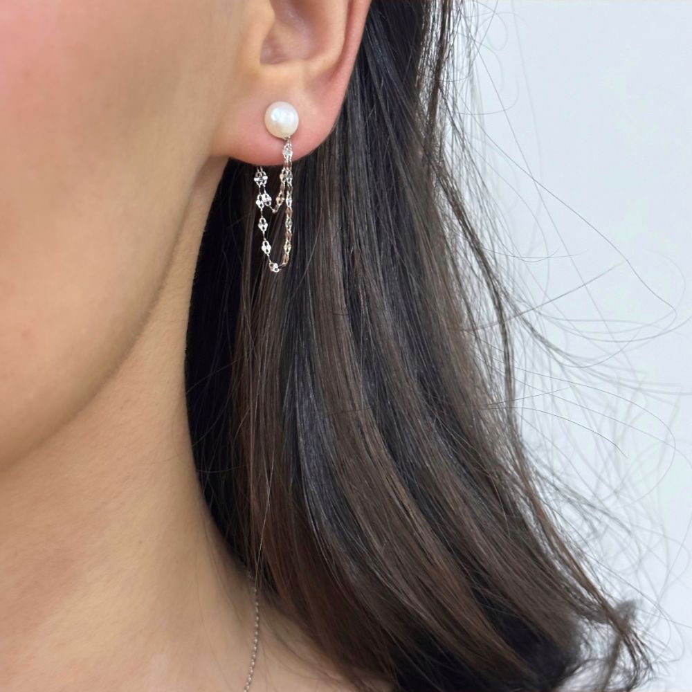 Cercei cu surub realizati din argint 925 placat cu rodiu, decorati cu 2 randuri de lant si perle de cultura.