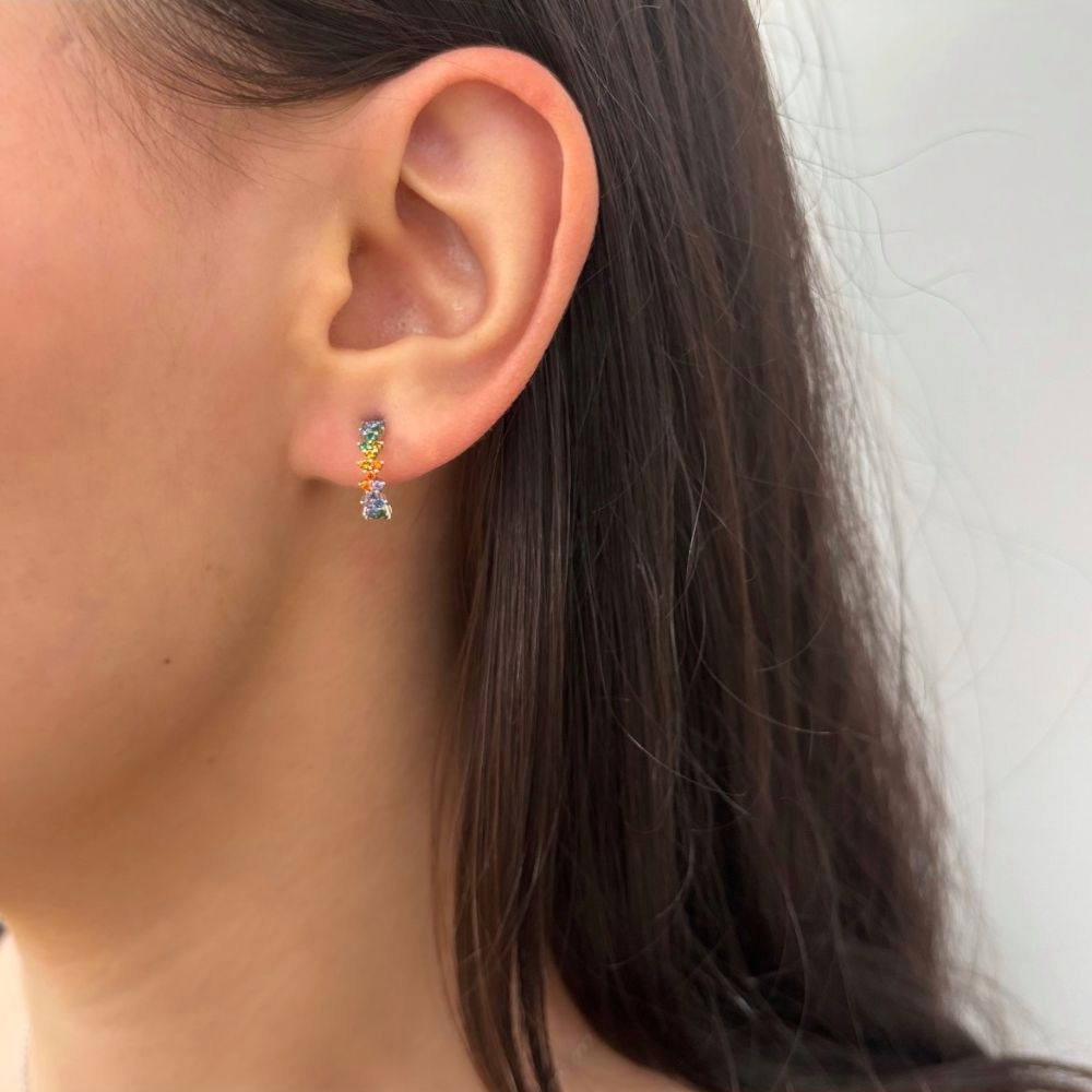 Cercei cu surub, tip creole, realizati din argint 925 placat cu rodiu, decorati cu cristale zirconia multicolore.