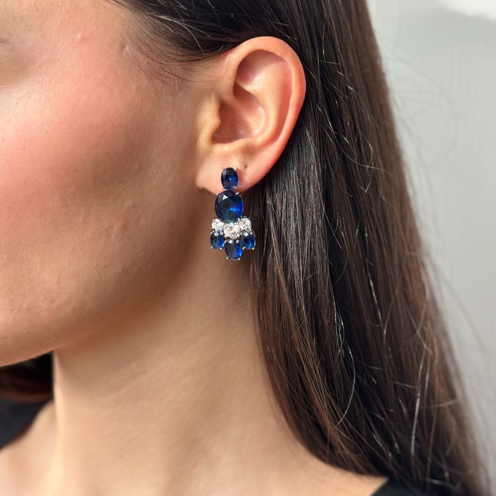 Cercei lungi realizati din argint 925 placat cu rodiu, decorati cu cristale zirconia incolore si albastre.