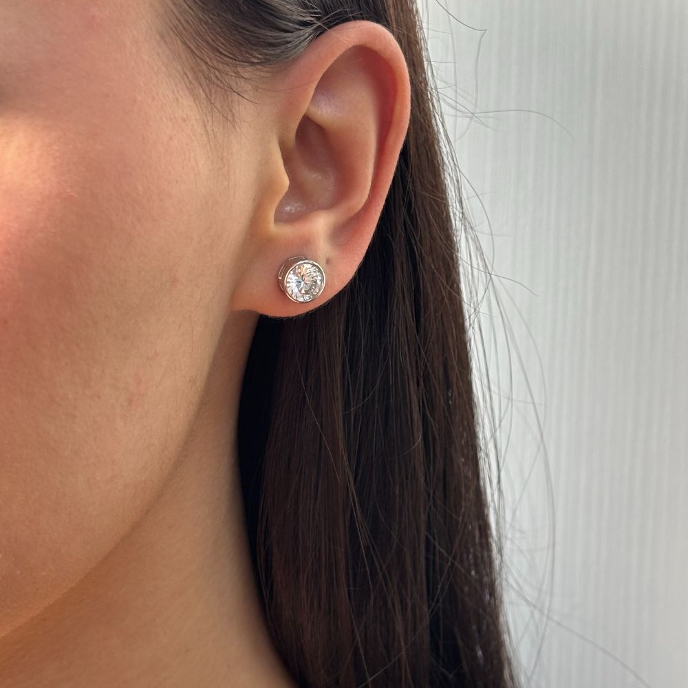 Cercei pe ureche realizati din argint 925 placat cu rodiu, cu cristale zirconia incolore rotunde.