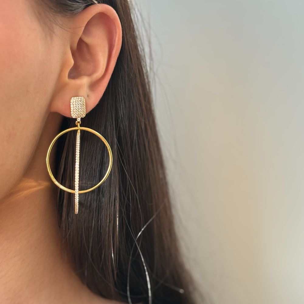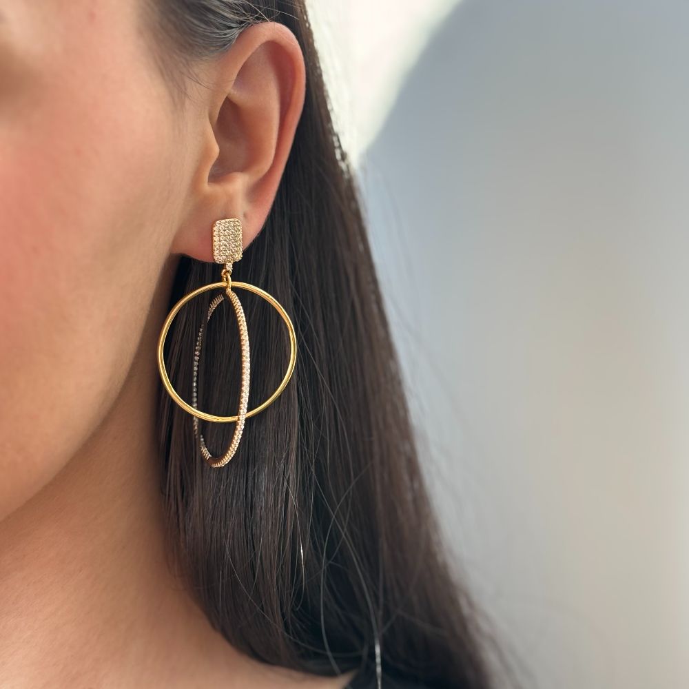 Cercei lungi realizati din argint 925 placat cu aur galben de 18 K, formati din 2 cercuri decorati cu cristale zirconia incolore.