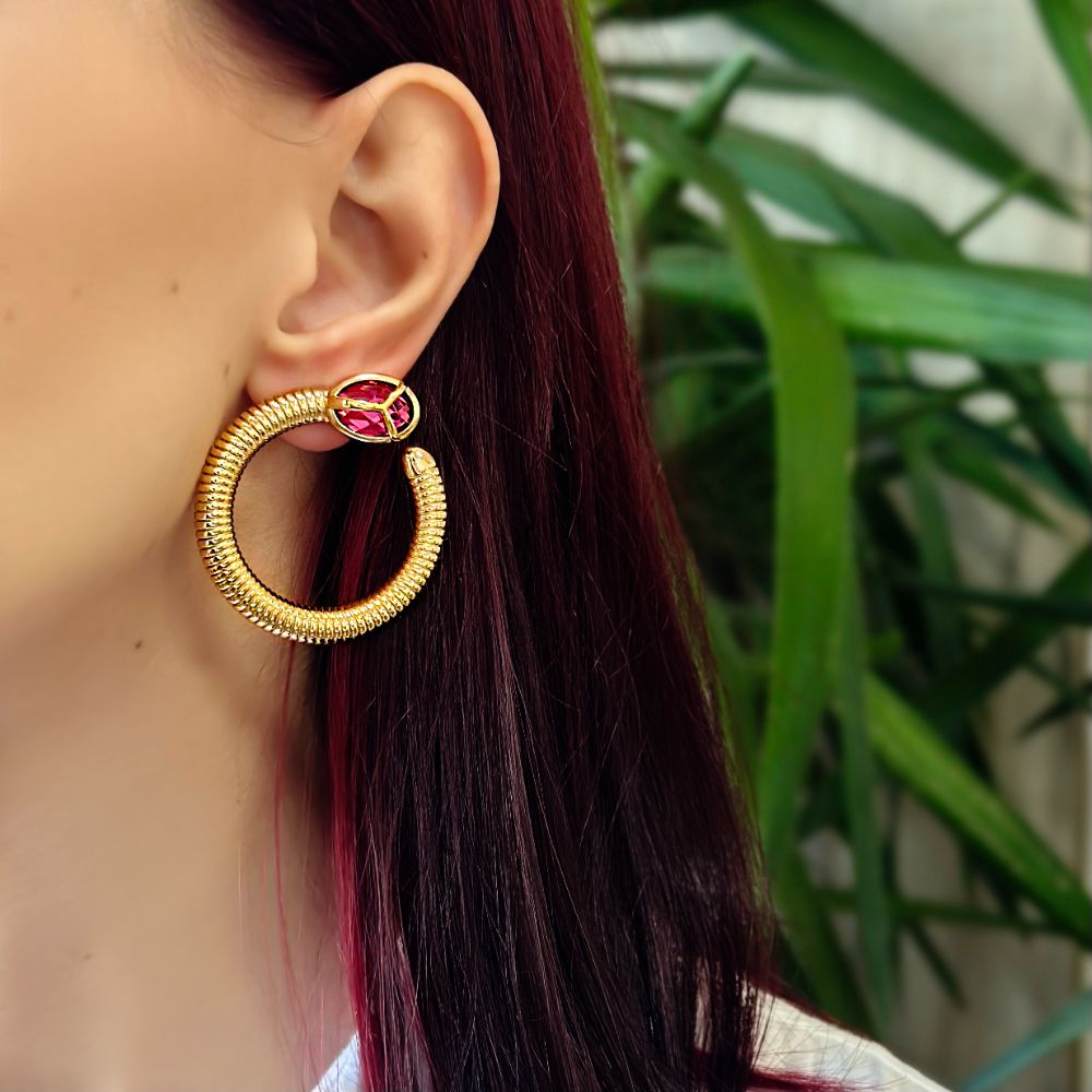 Descrierea produsului Cercei otel inoxidabil placat cu aur galben de 18 K rotunzi tip statemenet si pietre fucsia Extravaganza: