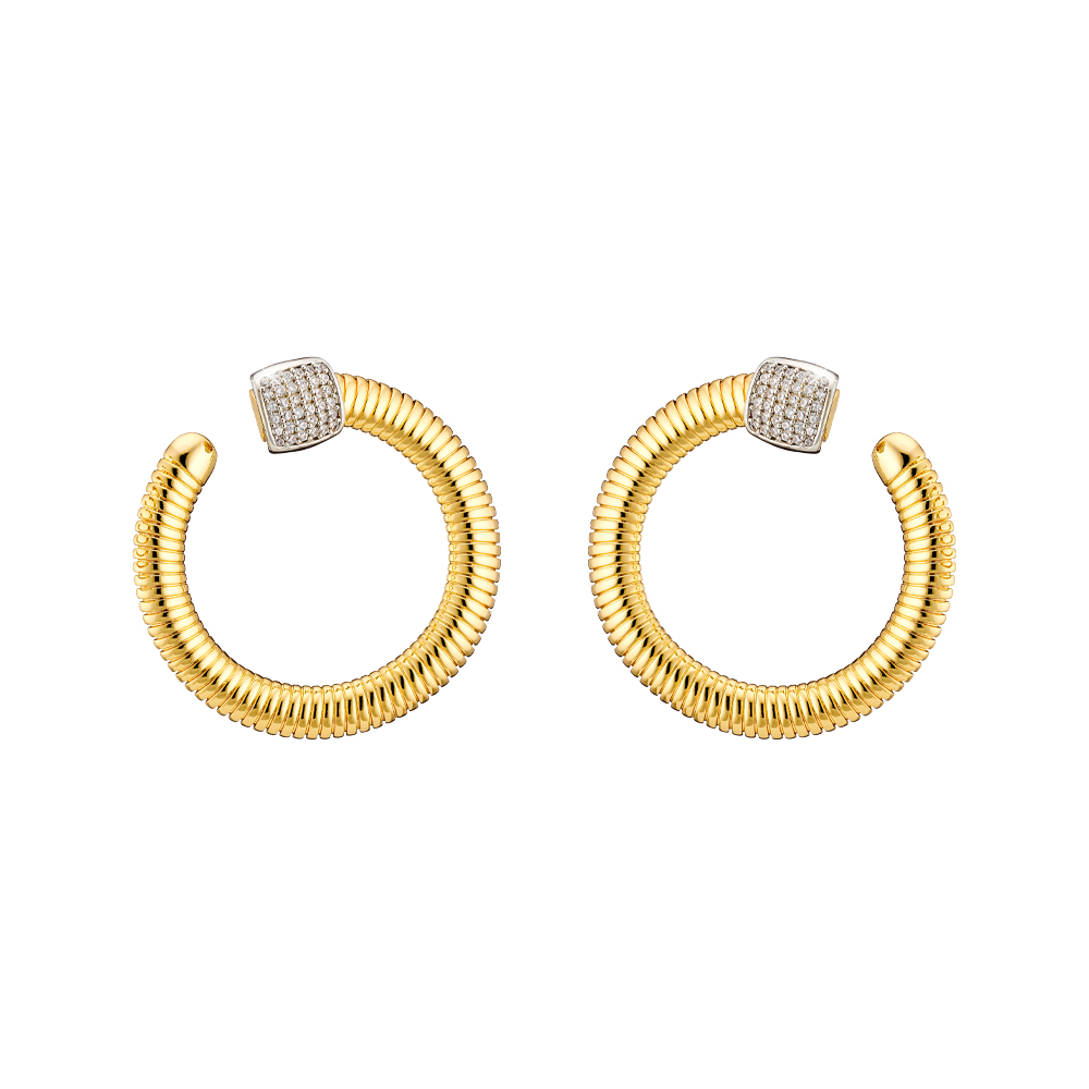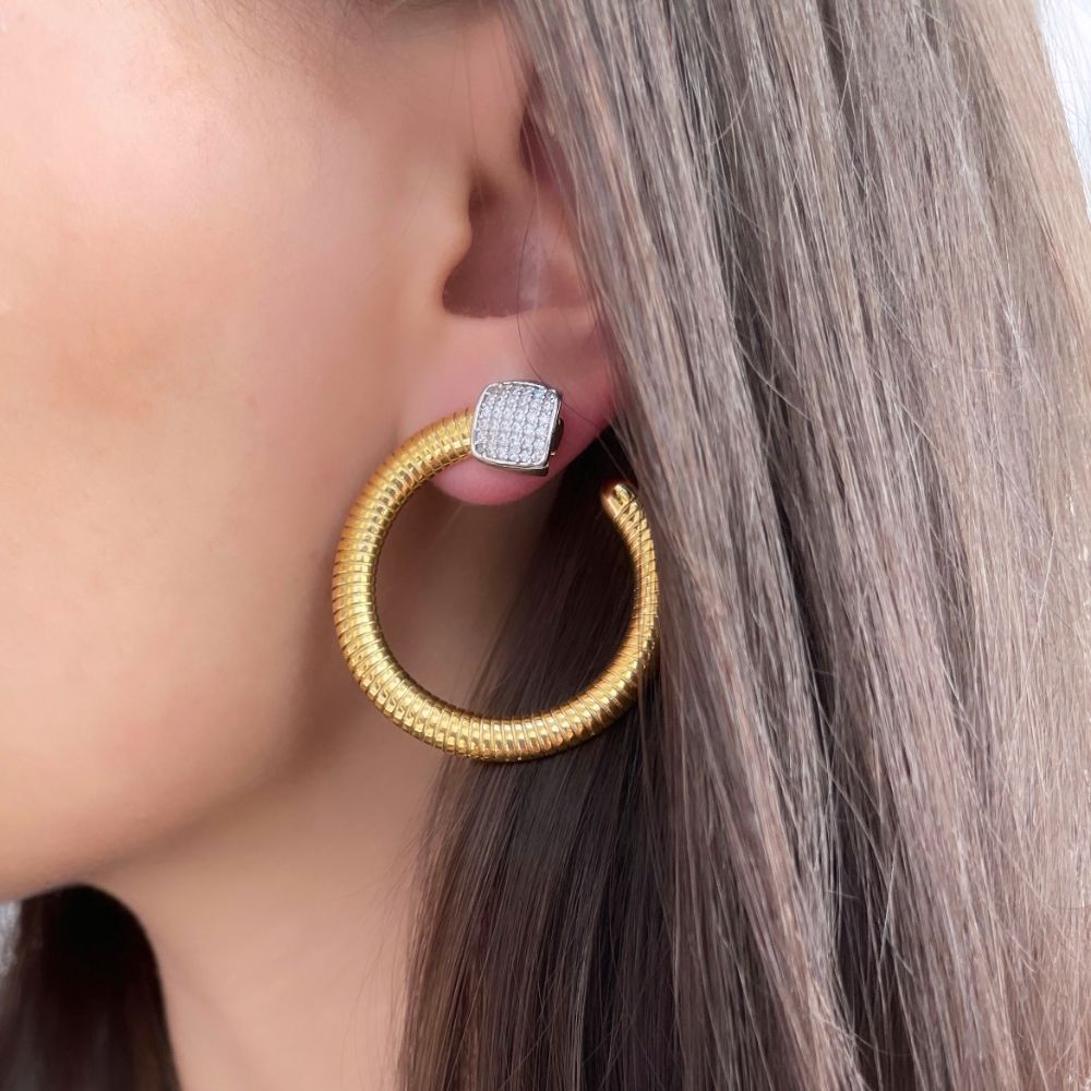 Cercei rotunzi, statement, realizati din otel inoxidabil placat cu aur galben de 18 K decorati cu elemente placate cu rodiu si presarate cu pietre cubic zirconia incolore.
