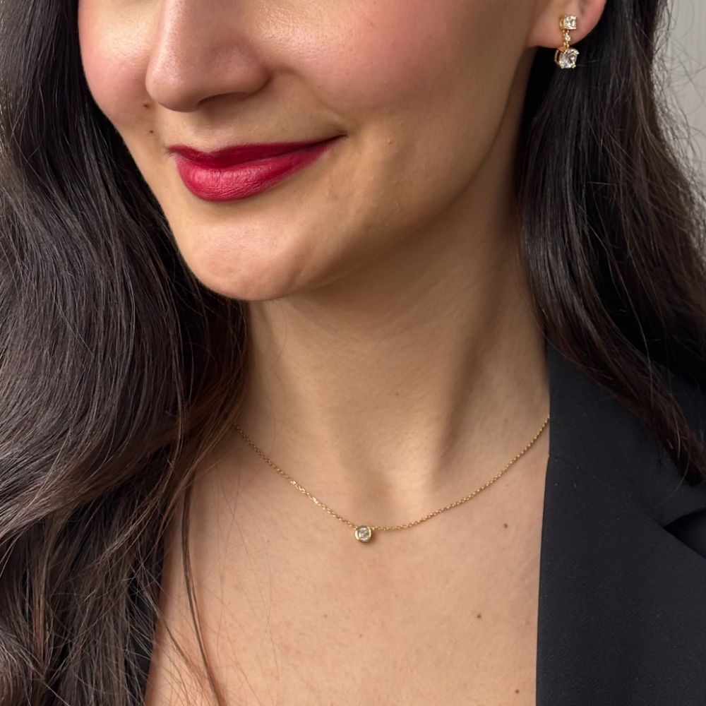Cercei cu surub realizati din metal comun placat cu aur de 18K decorati cu cristale zirconia incolore.