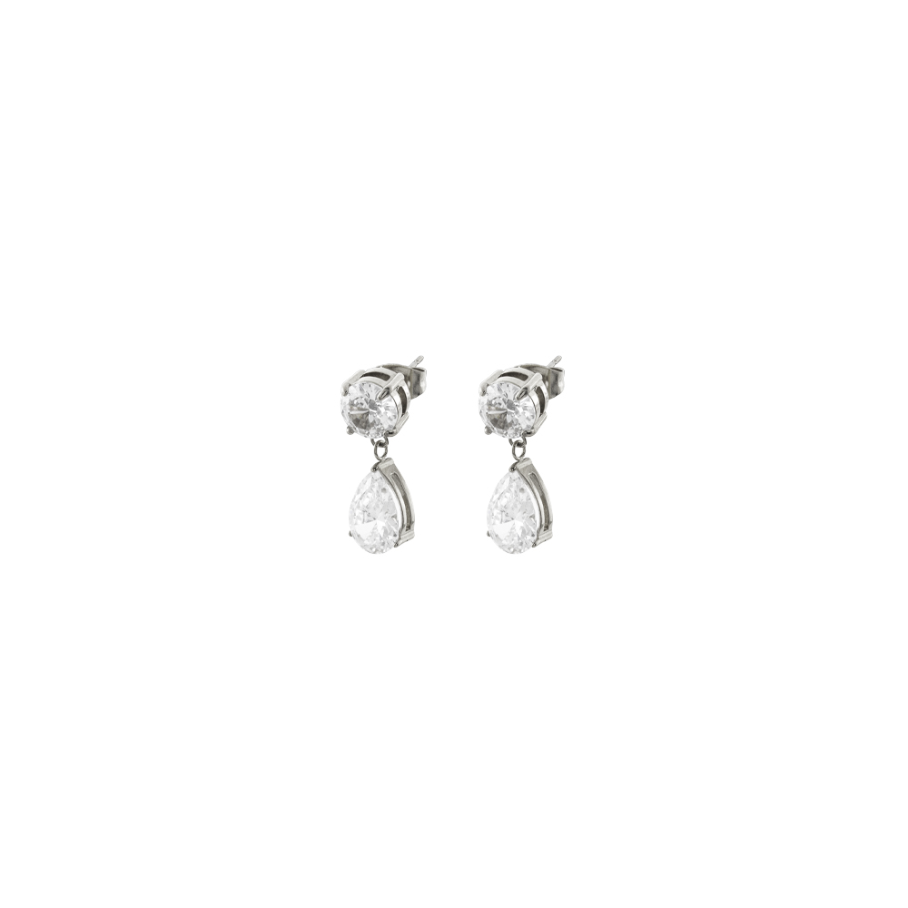 Cercei lungi realizati din otel inoxidabil placat cu rodiu decorati cu pietre cubic zirconia incolore.