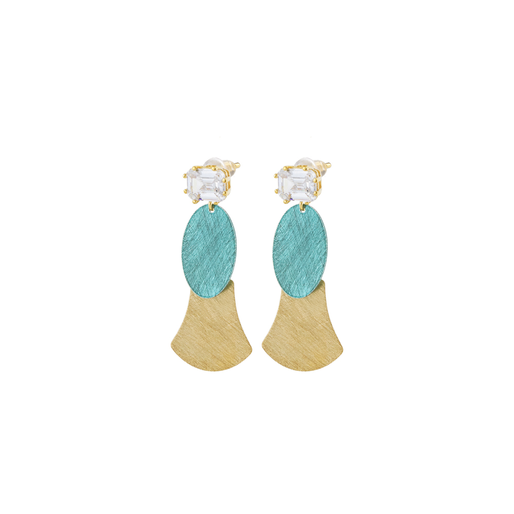 Cercei eleganti realizati din argint 925 placati cu aur galben de 18K decorati cu elemente geometrice aurii si verzi si pietre cubic zirconia incolore.