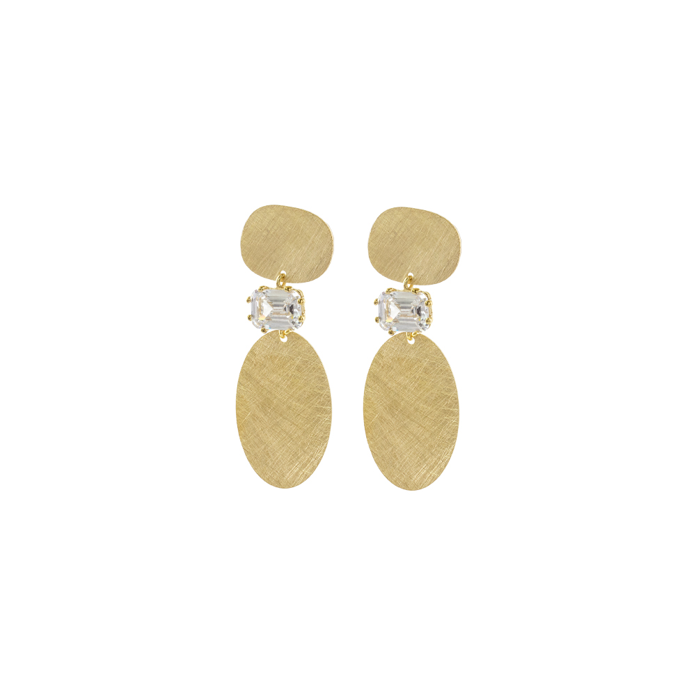 Cercei eleganti realizati din argint 925 placati cu aur galben de 18K decorati cu elemente geometrice aurii si pietre cubic zirconia incolore.