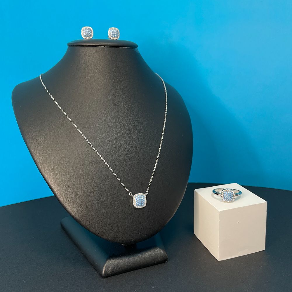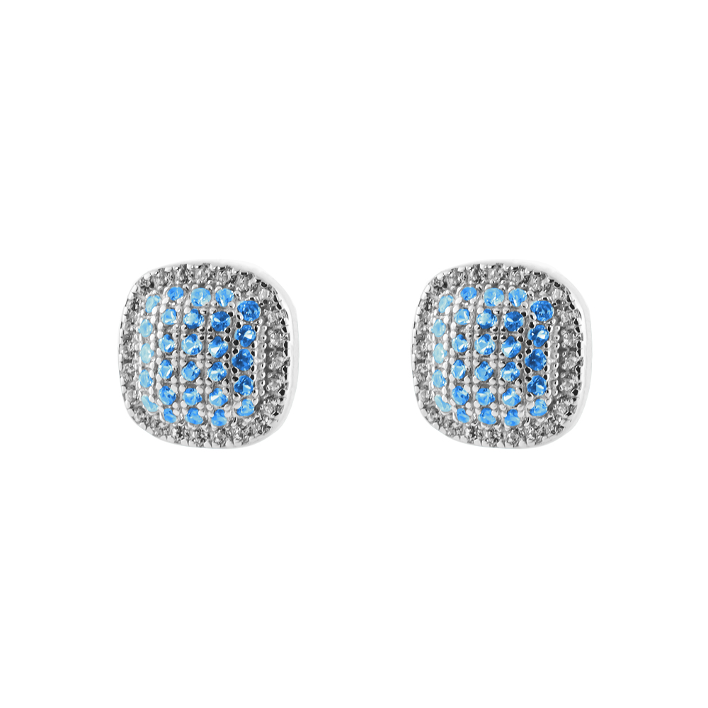 Cercei patrati pe ureche realizati din argint 925 placat cu rodiu si decorati cu pietre cubic zirconia albastre. Recomandari de purtare: