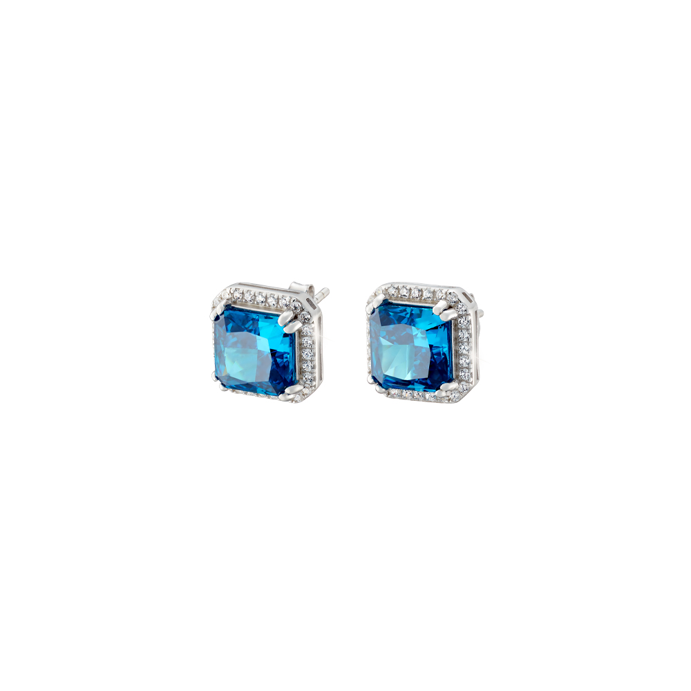 Cercei pe ureche realizati din argint 925 placat cu rodiu decorati cu pietre cubic zirconia patrate albastre si incolore. Recomandare de purtare: