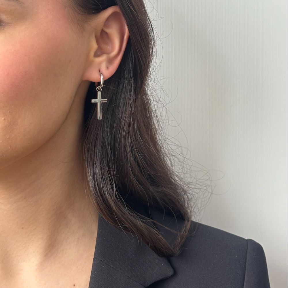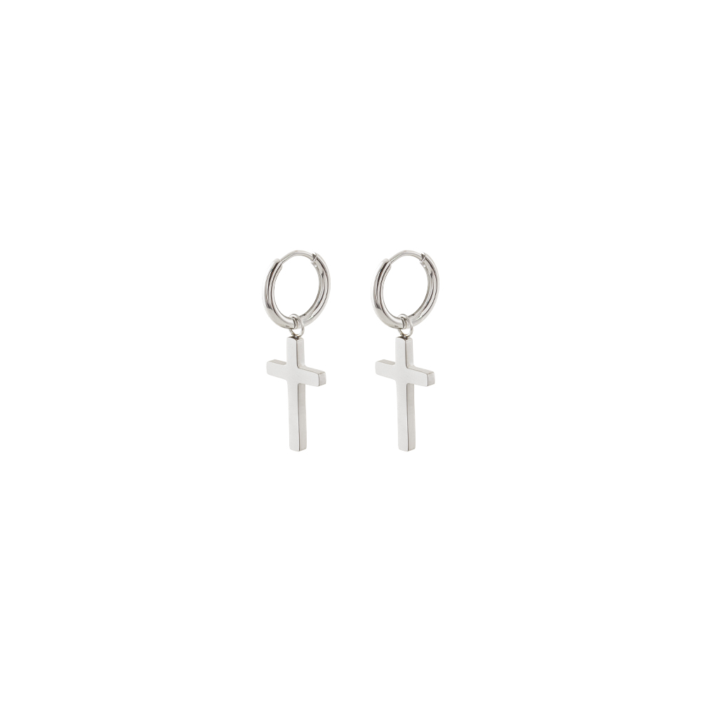 Cercei cu tortita realizati din otel inoxidabil placat cu rodiu decorati cu pandantiv cruce.