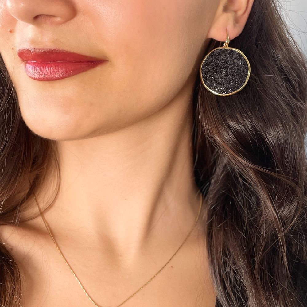 Cercei statement realizati din argint 925 placati cu aur galben de 18K decorati cu cristale caviar negre.